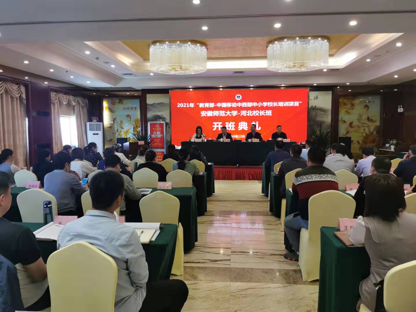 (2018级教育史 吕丽玲)经过紧锣密鼓的准备, 2021“教育部—中国移动中西部中小学校长培训项目”河北校长班开班典礼于2021年10月12日上午,在芜湖市外经凯莱大饭店顺利举行。参加本次开班典礼的有:安徽师范大学党委常委、副校长陆林,安徽师范大学继续教育学院院长汪健萍,安徽royal皇家88平台党委书记方泓,安徽royal皇家88平台副院长何海燕,项目首席专家教育科学学院段兆兵,继续教育学院杨国丽,本次培训班班主任教育科学学院姚运标,以及河北校长班的全体学员。会议由汪健萍主持。