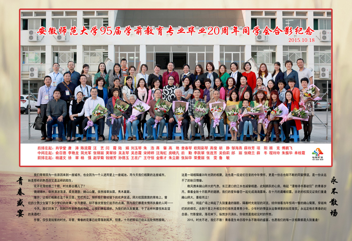 本网讯(93学前  李艳龙)在金秋送爽、丹桂飘香的季节,安徽师范大学校园里迎来了一批“特殊的客人”,他们是教科院93级学前教育专业专科班校友们。20年前,他们从师大出发,挥别青葱校园,踏上人生新一段旅程;20年后,他们再次回到师大,带着对母校、对青春岁月的无限思念与回忆重聚。1017日,教科院93级学前教育专业专科班的40余名学生从各地赶来,欢聚一堂,共叙同窗情谊。母校重聚,大家无比兴奋与激动,喜庆欢乐的场景感染着现场的每一个人。