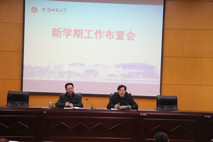 本网讯  教科院  卞纲要/文  莫大贡/图新春伊始,万象更新。2月21日下午,教育科学学院在赭山校区田楼报告厅召开全院教职工大会,院长桑青松教授向全体教职工通报了寒假期间学院的各项工作开展情况,并对2019年学院重点要开展的工作进行布置,会议由学院党委书记方泓主持。