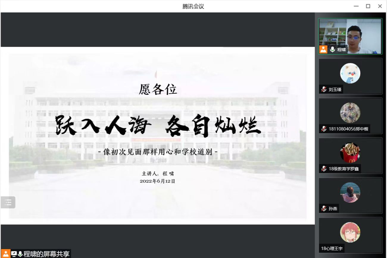 从5月中旬起,毕业生辅导员程啸通过开展多层次、多角度的摸底和调研,全面了解教科学子的毕业前状况、毕业离校期待,建立各种毕业群组,加强同学间、师生间的沟通与交流,缓解毕业前的失落和紧张情绪,开展毕业前教育。