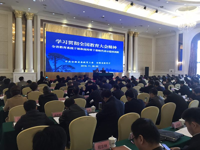 本网讯(教科院)11月下旬至12月上旬,省委教育工委、省教育厅在合肥、巢湖等地,先后举办三期学习全国教育大会示范培训班。教育部有关司局领导、省委教育工委主要领导、省教育厅主要领导分别结合安徽省教育实际,就学习贯彻全国教育大会精神做专题报告。我院阮成武教授受省委教育工委、省教育厅的指派,在培训班上做《新时代教育的新使命新作为》的辅导报告。