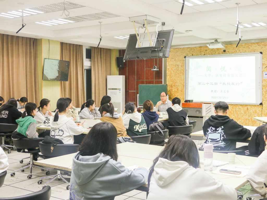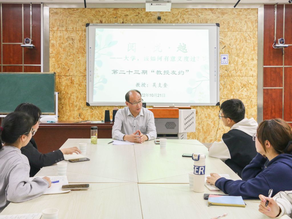 2022年10月21日晚,教育科学学院团委于田家炳教育书院8502教室组织开展第二十三期“教授友约”活动。本次活动邀请了安徽师范大学教育学专业教授吴支奎到场,向同学们分享了有关“阅、悦、越——大学该如何有意义地度过”等内容。