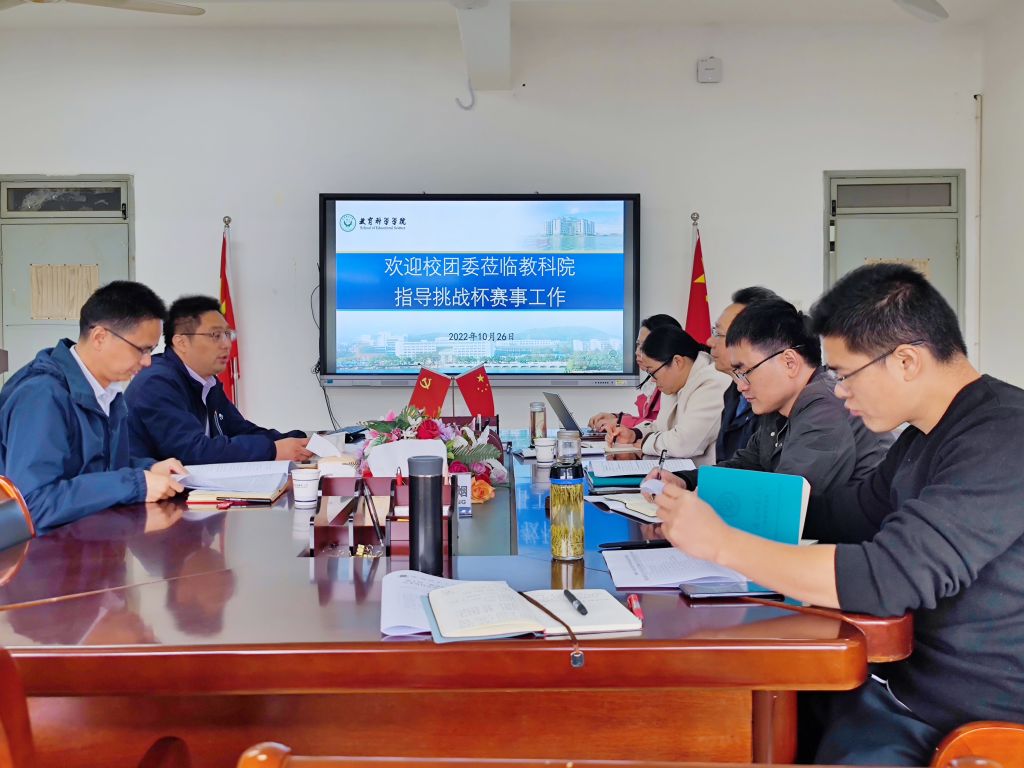 2022年10月26日上午,校团委书记、大学生艺术教育中心主任汪凯、校团委副书记廖仲明到教育科学学院调研指导“挑战杯”赛事工作。院党委书记方泓、党委副书记杜凤、副院长韩建涛、副院长吴文涛、副教授陶佳、院团委书记张理强参加了会议。