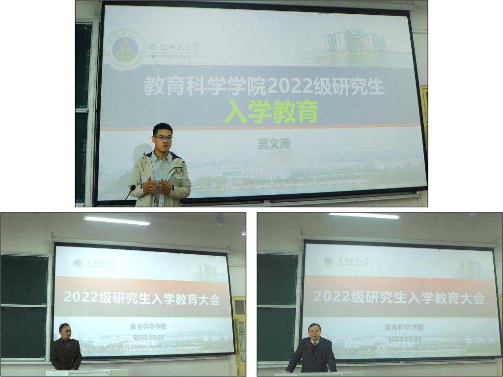 在深入学习宣传贯彻党的二十大精神之际,为加强新生思想政治教育,切实帮助新生研究生尽快适应学校生活,10月30日上午,教科院于1401教室召开2022级硕士研究生入学教育大会,院党委书记方泓、院长李宜江、副院长张更立、韩建涛、吴文涛;各学位点负责人周元宽、杨晓奇、孙德玉、吴支奎、方双虎以及研究生辅导员谭茹轩、程啸参与本次会议。全体2022级硕士研究生到场, 会议由22级研究生陈晨主持。