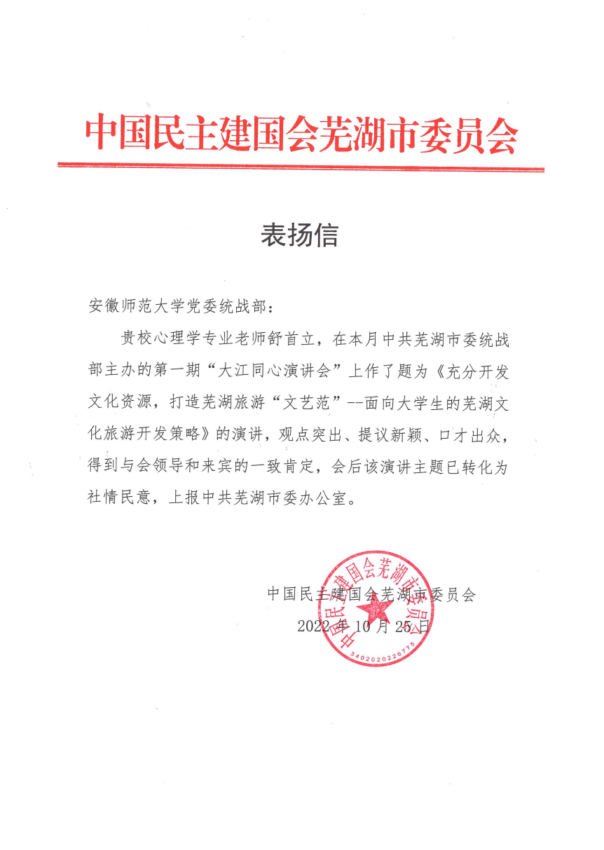 会后,民建芜湖市委会专程向学校发来表扬信。