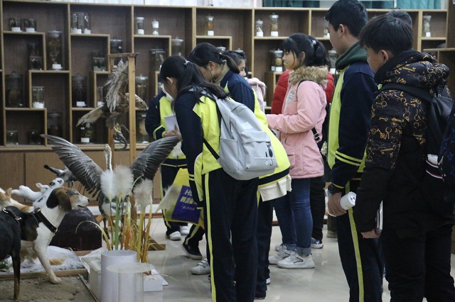 听完讲课后,同学们来到我校的标本馆。馆内琳琅满目的标本,极大地激发了同学们的学习兴趣,他们时而询问、时而低头记录。
