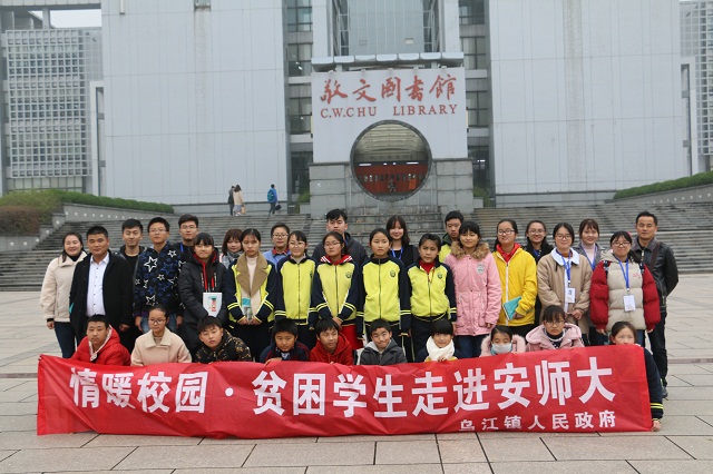 本网讯(教科院 高凡 张亚楠)为了进一步推动贫困家庭学生关爱帮扶工作的开展,加强对贫困家庭学生的心理关怀和精神成长引导,11月21日,和县乌江镇人民政府、县青年志愿者协会与我院联合开展“情暖校园,贫困学生走进安师大”活动。乌江镇部分建档立卡家庭的初中生到我校进行一天的学习和生活体验,感受师大的人文风采。随同学们一同前来的还有乌江镇党委副书记秦勇、乌江镇政府宣传室副主任余华兵乌江镇政府计生办办事员葛静树、乌江中学政教处主任何庭、卜集中学团委书记刘静婷、卜陈中学学生辅导员赵龙华、和县青年志愿者协会秘书长马宁。