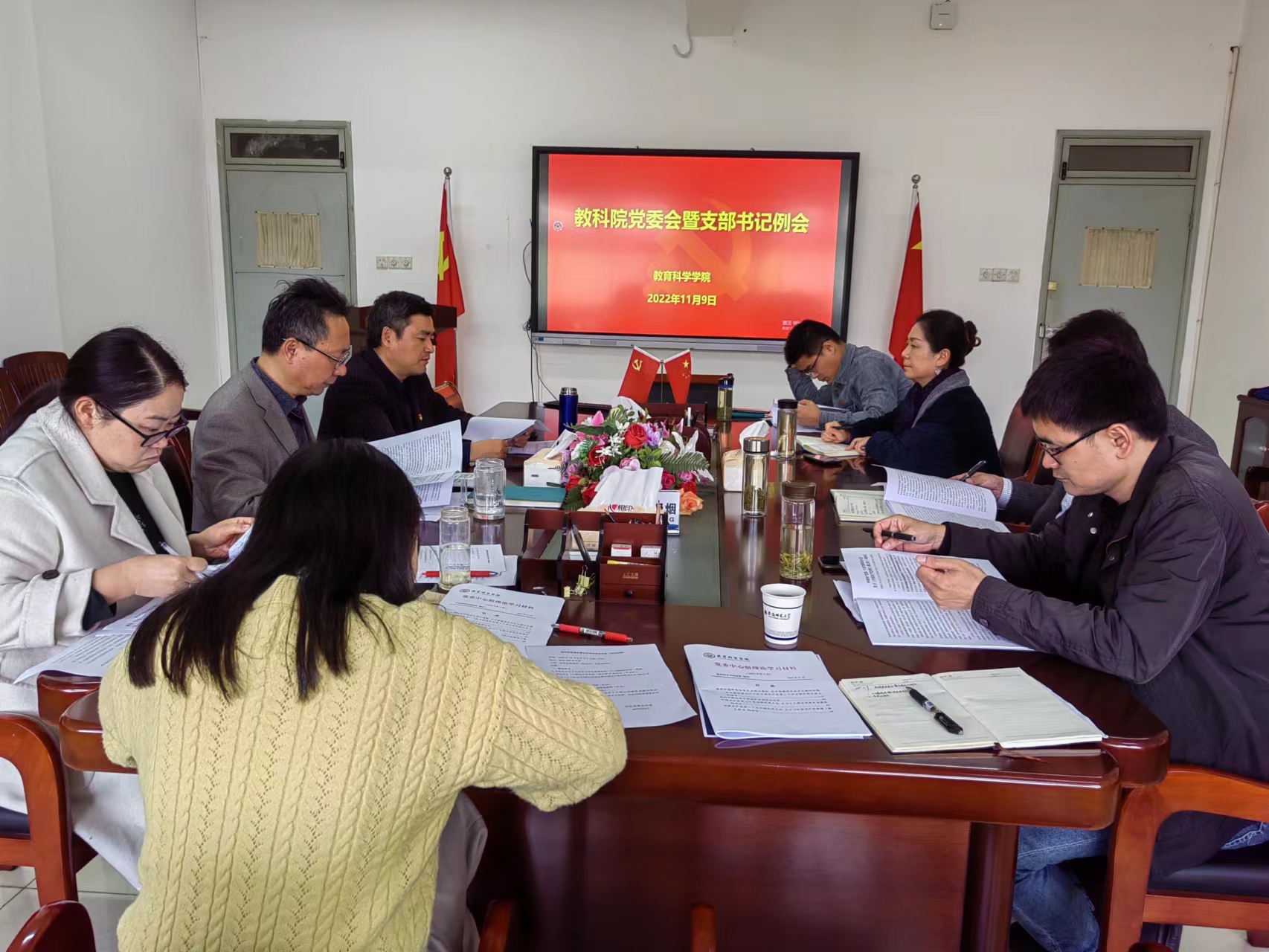 (教科院 袁黎平 桂先梅)11月9日下午,教科院在308会议室召开党委理论学习扩大会专题学习党的二十大精神。会议由学院党委书记方泓主持,学院党委委员、各党支部支委成员参加会议。