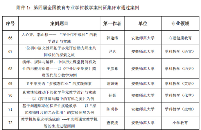 近日,第四届全国教育专业学位教学案例征集工作评审结果公布,在校研究生院指导下,挂靠在教育科学学院的安徽省教育专业学位案例库和教学案例推广中心推荐的7篇优秀教学案例成功入选中国专业学位案例中心案例库,案例入库数在62所参评高校中排名第二,在全国教育硕士培养单位中名列前茅。