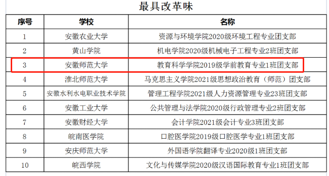 为贯彻落实《高校共青团改革实施方案》文件精神,深入实施高校基层团支部“活力提升”工程,团中央于2022年秋季学期开展高校“活力团支部”创建遴选活动。2019级学前教育专业1班团支部经过校级评选推荐、校级展示、省级展示、网络投票和答辩评审等环节,于近日在全省高校团支部中脱颖而出,获评2022年度安徽省高校“活力团支部”最具改革味荣誉称号。
