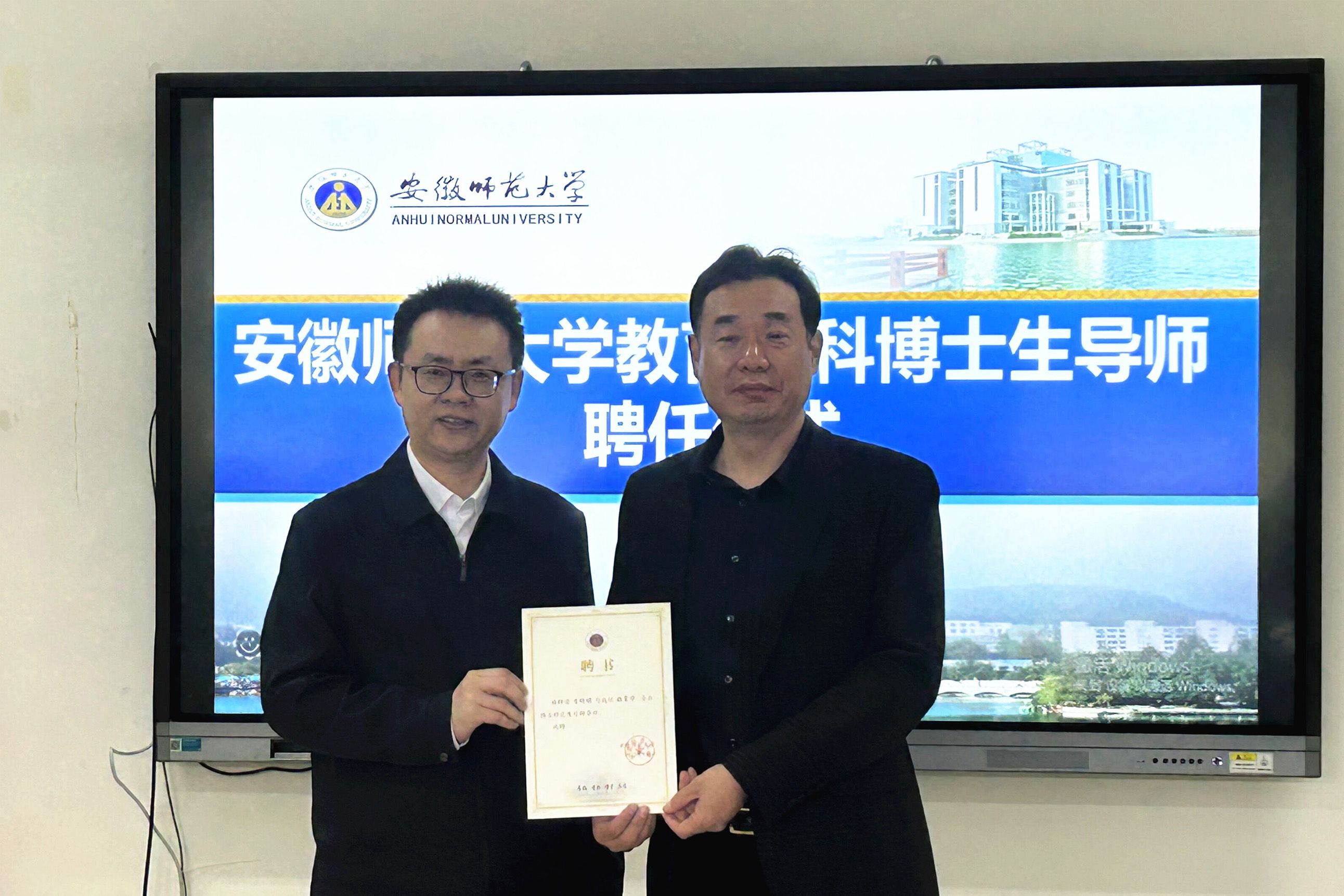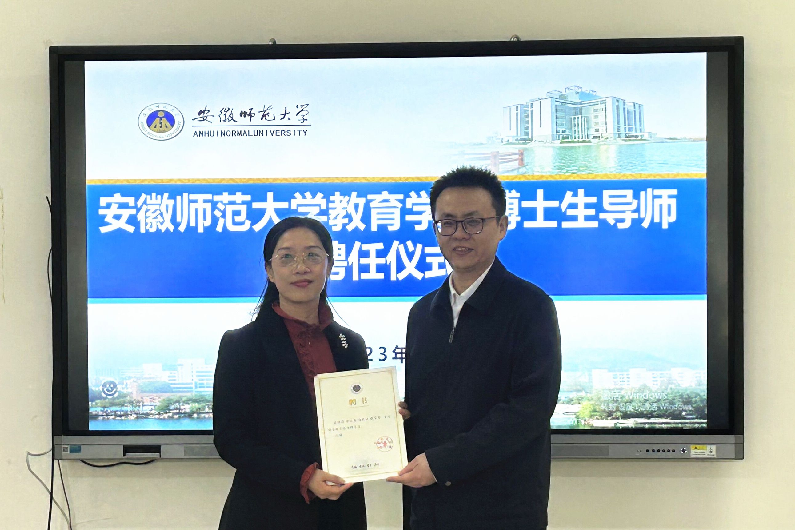 会上,李宜江首先对吉校长、沈院长一行的到来表示热烈欢迎,并简要介绍了我院的发展现状和研究生人才培养情况;随后朱家存副校长回顾了教育学学科建设发展历程和教育学博士点申报的过程,强调了我校教育学科的发展优势;接着熊宇杰副校长代表学校为吉明明、李红美两位新聘任博士生导师颁发聘书。新任的两位博士生导师就我校长期以来对南通大学、尤其是教育学学科的帮助与支持表示感谢,表示今后会以博士生导师的标准严格要求自己,尽自己所能为安徽师范大学的发展尽一份力,并诚挚地邀请我校各位领导老师到南通大学交流指导。