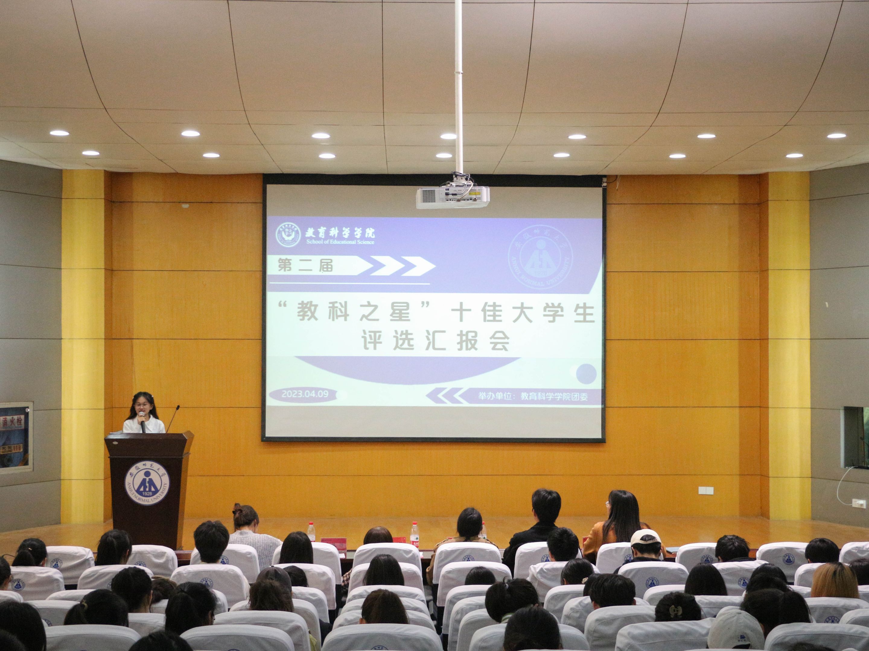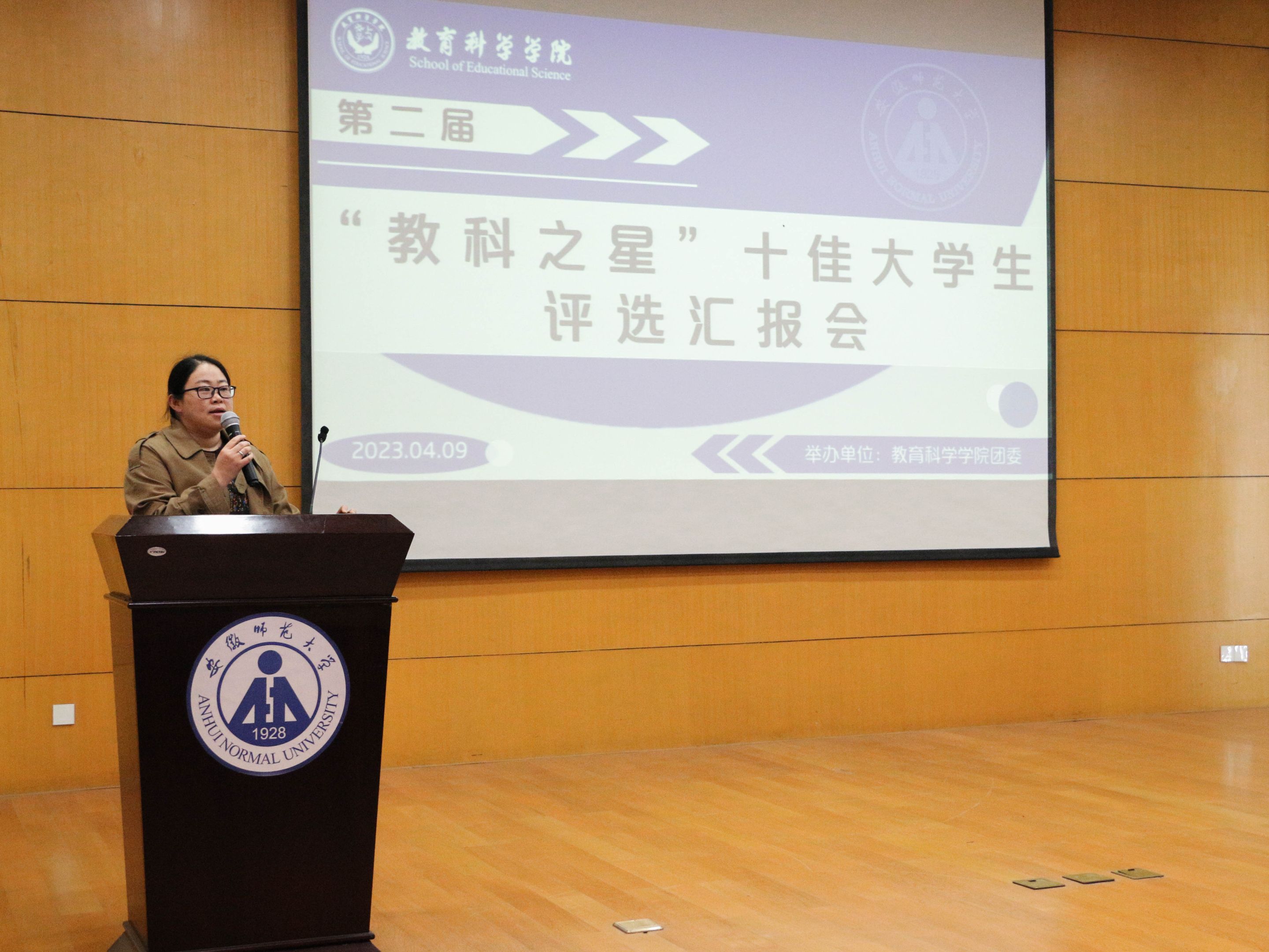 为进一步发挥青年先进典型模范带头作用,培养有理想、敢担当、能吃苦、肯奋斗的新时代好青年,4月9日下午,教育科学学院于赭山校区田楼报告厅举办第二届“教科之星”十佳大学生评选汇报会。院党委副书记杜凤、小学教育专业负责人王芳、院团委书记张理强、院团委副书记付银行、2021级辅导员赵茜、2022级辅导员程雅楠出席活动并担任评委,各年级学生代表现场观摩。