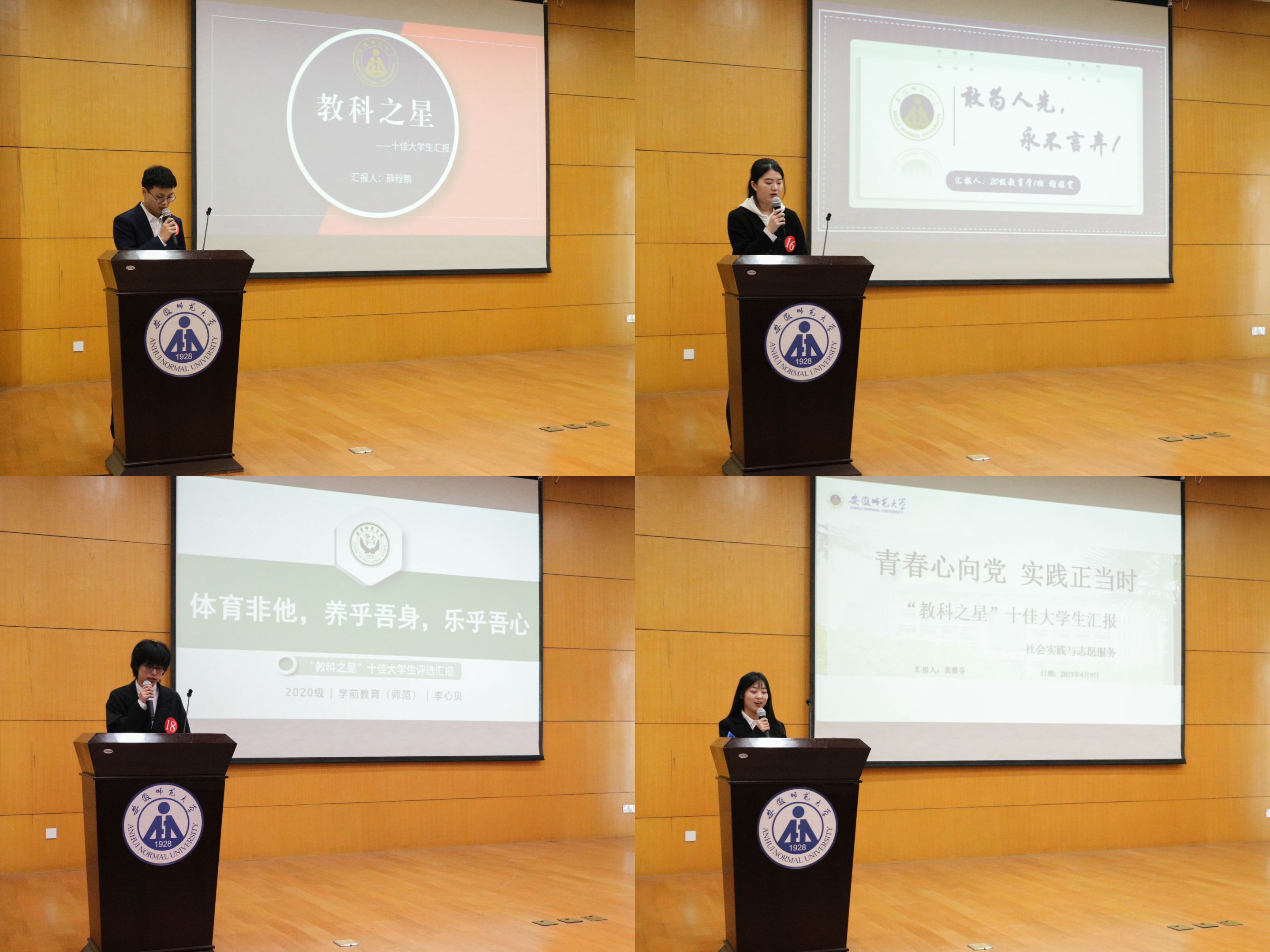 经过自主报名、班级推荐、资格审核等环节,共19位候选人参与现场汇报答辩。候选人通过PPT展示,围绕“道德示范与自强奋斗”“社会实践与志愿服务”“科技创新与自主创业”“文艺创作与体育锻炼”四个类别,结合自身学习、思想、工作、实践等经历与成果进行汇报,展示了师大优秀教科人的拼搏精神与青春风采。