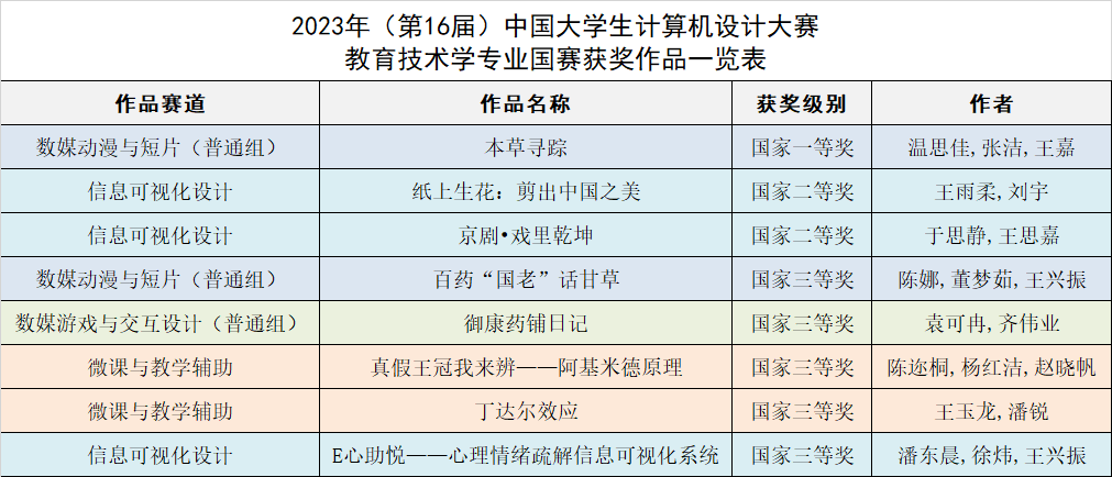近日,第16届中国大学生计算机设计大赛全国总决赛落下帷幕。我院教育技术学团队入围国赛的8件作品,分别在沈阳、厦门、杭州三个赛点四个赛道与来自全国高校的优秀作品展开激烈竞争,共获国家级一等奖1项,二等奖2项,三等奖5项,获奖率达100%,刷新了我院在该项赛事的最好成绩,实现了国家级获奖质量和获奖数量的双突破!20级教育技术学班级取得了专业历史上一次比赛斩获8项国家级大奖的骄人成绩!