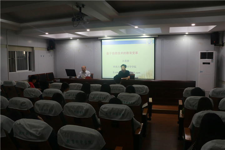 本网讯(王凯莉/文 汪颖/图)5月28日上午,在我院三楼学术交流中心,河南大学教育科学学院院长、博士生导师汪基德教授应邀开展了题为“基于信息技术的教育变革”的学术讲座。讲座由桑青松院长主持,袁晓斌副教授、许之民副教授出席,教育技术学、教育学原理和课程论专业研究生到场聆听。