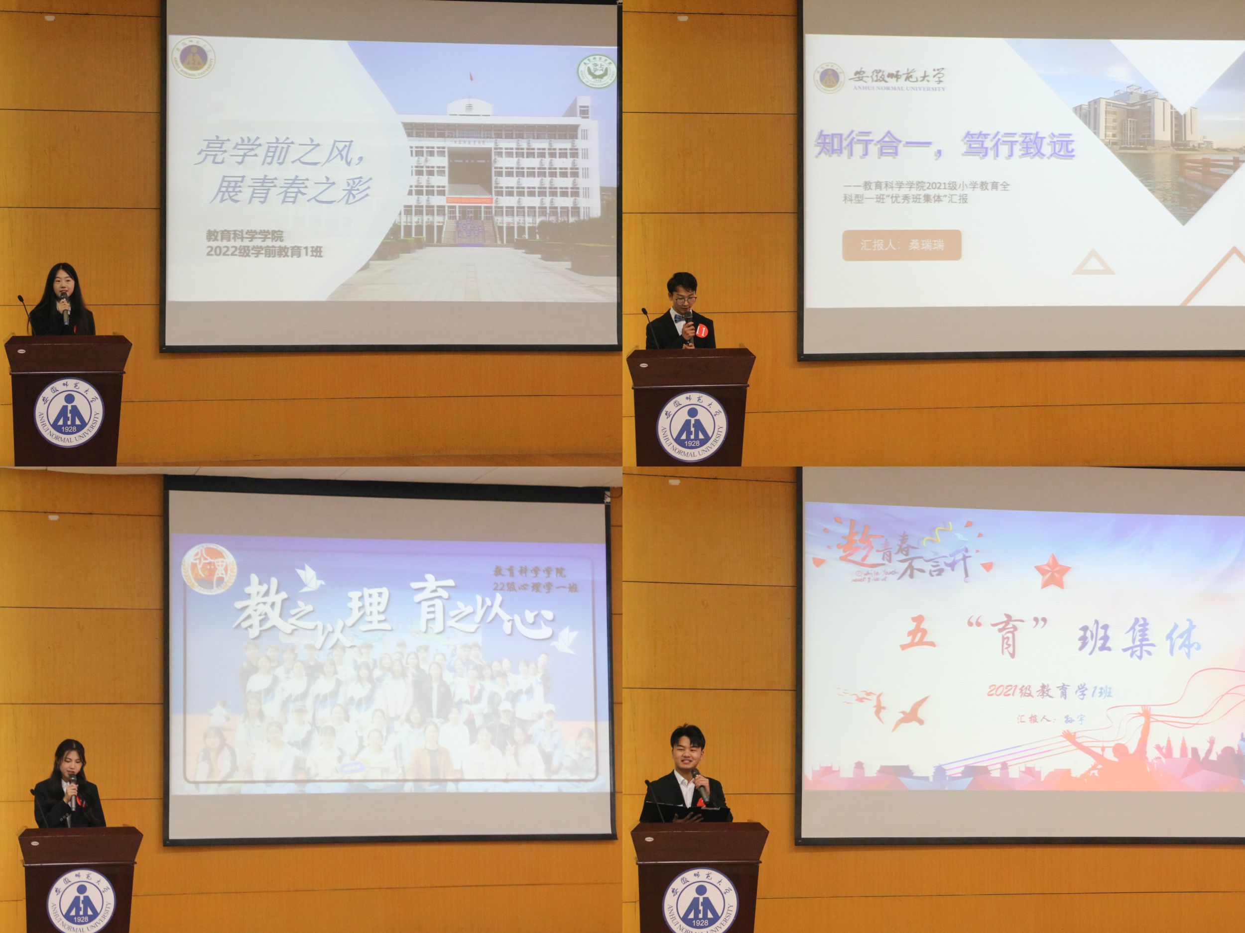 此次评选共有来自2021级、2022级的17个班级参与。各班级的评选代表通过ppt、视频、实物展示、配乐诗歌朗诵等丰富多彩的形式进行汇报展示,围绕组织建设、学风建设、思想引领、基础文明、社会实践、日常管理等全方面展现各班级的整体风貌,突出了班风学风、集体文化氛围、班级目标及特色活动,集中体现了教科学子厚德、重教、博学、笃行的精神风貌。