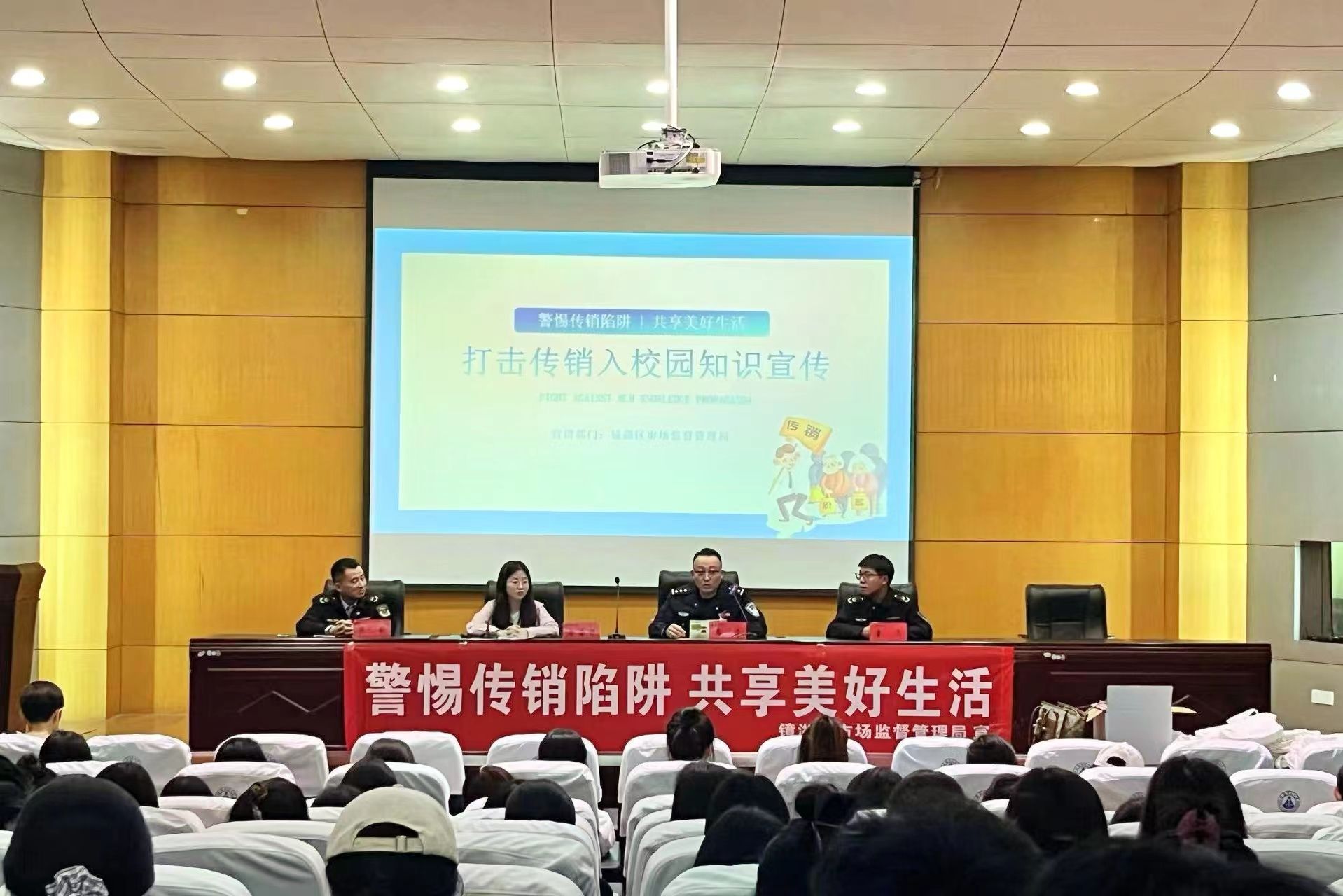讲座首先由镜湖区市场监督局市场规范科陈昕带领同学了解关于传销的具体内容,围绕什么是传销、传销常见的手段、传销的危害以及如何防范传销进行了详细介绍,并通过多个具体事例和同学们展开深入互动交流。之后赭山派出所凤凰山社区民警周俊又以《孤注一掷》为例讲述传销的恐怖之处,劝告同学们不要轻信刷单、客服退款、询问顾客要验证码等骗局。警官们现场给同学们发放了防传销手册包,提醒同学们在日常生活中提高警惕,防范传销。