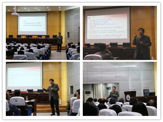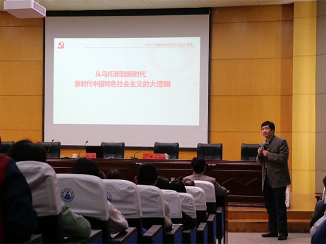 院党委书记方泓首先发表讲话,他强调了学校关于组织十九大精神学习贯彻的深刻意义,并热烈欢迎胡靖部长前来我院进行辅导。随后,胡靖部长的讲座正式开始。他首先强调习近平总书记提出的 “学懂弄通做实党的十九大精神”的重要意义,指出我们要采取理论与实践、历史与现实、当前与未来相结合的方法,将十九大精神领会准、领会深、领会透。基于此,他引出了讲座的主题——《从乌托邦到新时代——新时代中国特色社会主义的大逻辑》。胡靖部长主要从“三个逻辑”出发,从科学社会主义理论、世界社会主义进程和中国社会主义实践三个角度出发,系统解读新时代中国特色社会主义。胡靖部长以宏大的历史视角,严密且具有逻辑的思维体系,讲述了空想社会主义失败的必然性和马克思科学社会主义理论的先进性和进步性;接着他从世界社会主义进程出发,介绍社会主义从一国到多国的胜利直至苏联社会主义的失败,深刻剖析了社会主义曲折进程的历史原因,进而指出“道路决定命运”,只有明确把握“什么是社会主义?怎样建设社会主义?”这个方向性的问题,才能找到社会主义发展的出路;最后,他从现实逻辑出发,指出新时代中国特色社会主义是夺取社会主义革命胜利的必由之路,是中华民族的复兴路、中国人民的幸福路。
