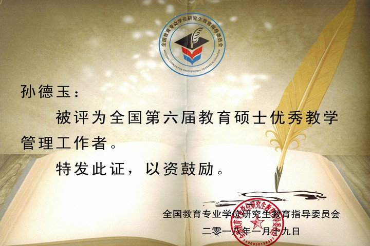 葛金国、孙德玉两位老师长期以来注重硕士研究生培养质量。此前两位老师曾多次获得省部级以上荣誉。葛金国老师曾获“全国首届教育硕士优秀教师”称号,2010年再获“全国教育硕士专业学位优秀教师”称号。指导的研究生论文多次获评省级、国家级优秀论文。孙德玉老师曾作为教育硕士教育管理方向负责人、教育史二级学科硕士点点长先后被安徽省教育厅授予“安徽省家庭教育十佳园丁”,被教育部、全国妇联授予“全国家庭教育工作园丁”称号,获“安徽省家庭教育十佳先进工作者”称号。他是三尺讲台上循循善诱的引导者、科研领域孜孜不倦的学者,同时还是家长、同行眼中优秀的教育工作者。葛金国、孙德玉两位老师此次受到表彰充分说明了全国教育专业学位研究生教育指导委员会对两位老师工作的肯定。