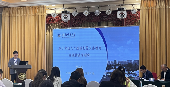 在会上,徐赟老师应邀在分论坛一:教育法律制度确立与完善研究作专题报告,徐赟老师报告的主题是“教育法典服务终身教育体系构建的理论逻辑与可能路径”。在整个报告过程中,徐赟老师高屋建瓴,从终身教育体系构建及其立法技术之困、教育法法典化的推进及其价值定位之谜、终身教育体系构建与教育法法典化的内在逻辑、教育法典服务终身教育体系构建的可能路径等四个方面对教育法典服务终身教育体系构建的理论逻辑与可能路径做了系统的论述,受到与会者的一致好评。陈元龙老师参加了分论坛四:教育政策与教育法律热点问题研究,就其主题“基于常住人口规模配置义务教育资源的政策研究”做了精彩的报告。陈元龙老师通过全国、省级和区域层面的3个数字简单阐述了研究背景,并立足安徽省情,解释了常住人口的概念内涵。以义务教育资源配置的现实局限为逻辑起点,阐述新时代义务教育资源配置的三重定位,并结合区域特征提出基于常住人口规模配置义务教育资源的策略。