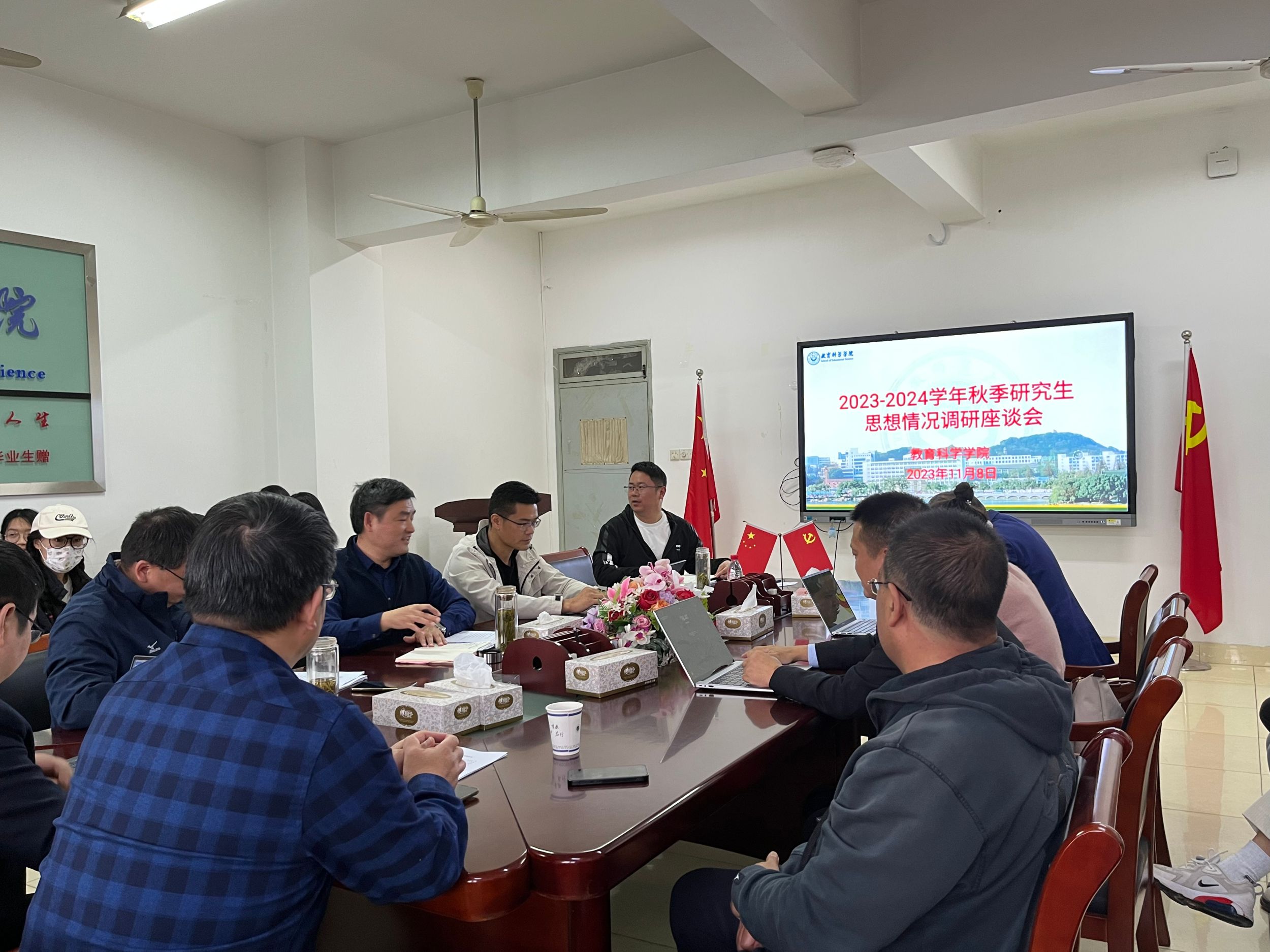 莫大贡传达了学校关于秋季研究生思想情况调研的相关文件精神,鼓励学生在思想、学习、生活和就业等方面多提意见。在座谈会中,各位研究生代表踊跃发言,结合班级同学反馈的问题围绕思想动态、学习科研、日常生活等方面发表了各自的看法和建议,现场气氛十分活跃。