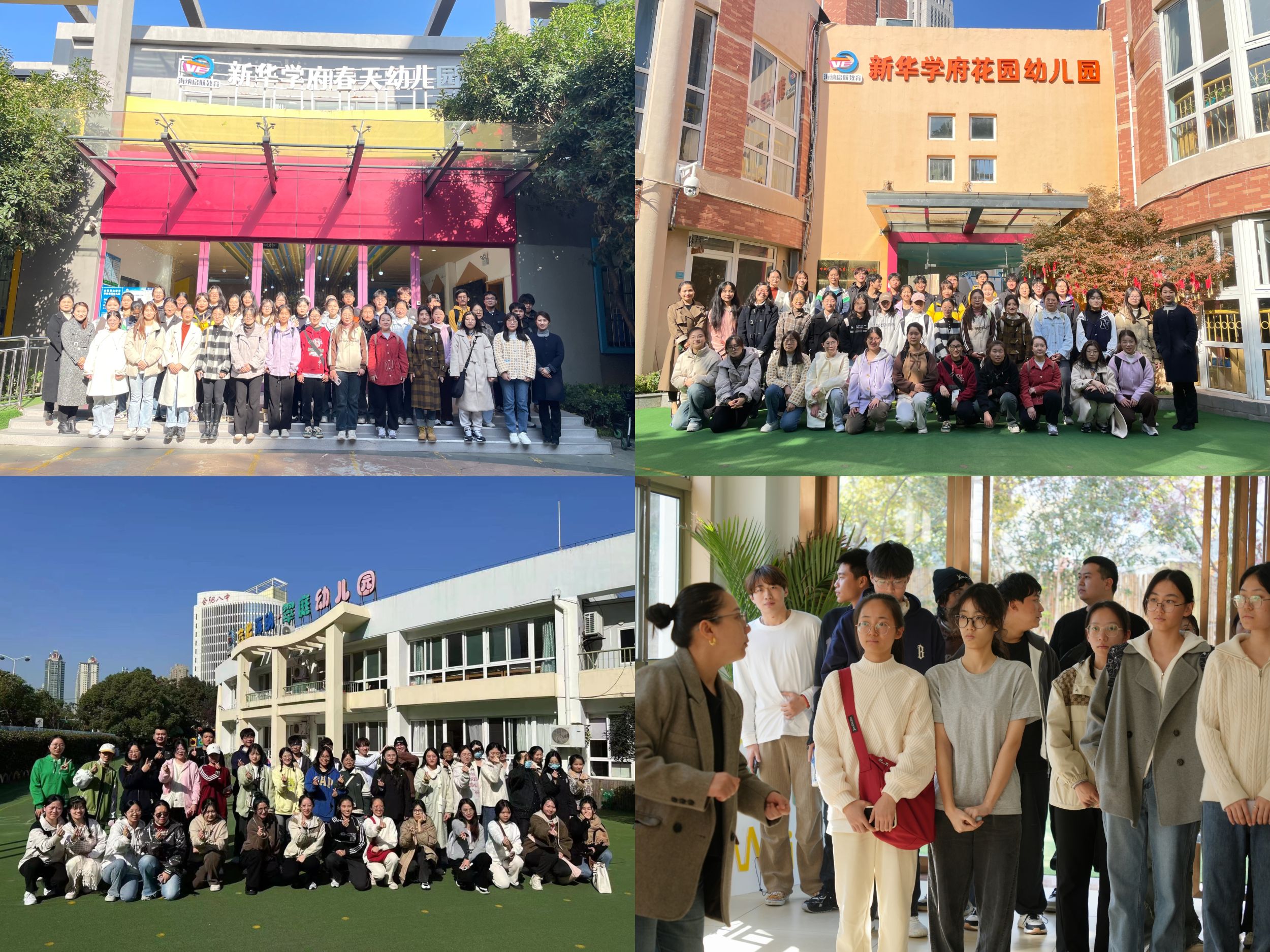 学院师生共同参观了海纳启航美域幼儿园、海纳启航学府花园幼儿园、海纳启航翠庭幼儿园、小启航托育学府银座校区、海纳启航春天幼儿园和新华幼教集团总部等园区,了解新华幼教集团的企业文化和基本概况,同时回访慰问了2023届学前教育本科毕业生在幼儿园的工作和生活情况。