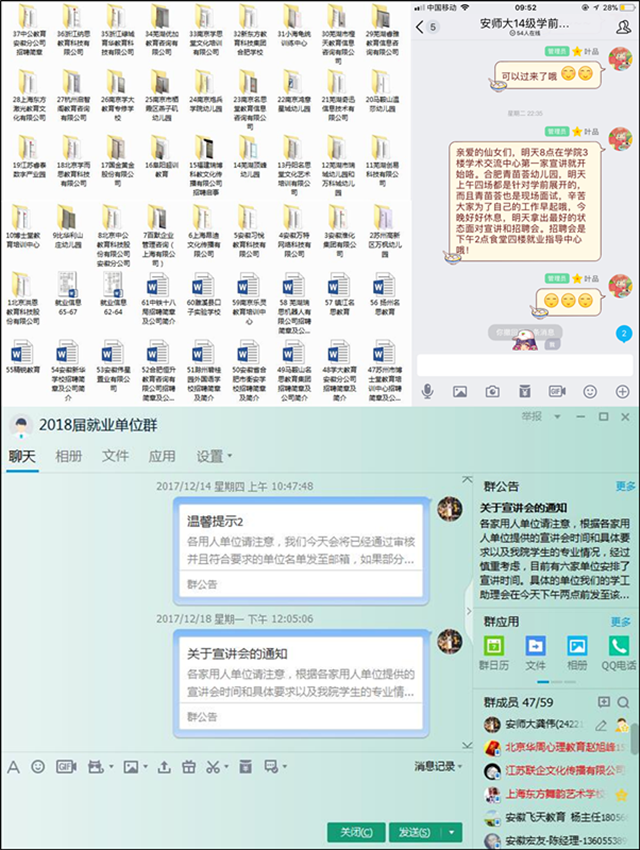 本次招聘会的成功开展,前后准备了一个月时间,以保研同学和党员同学为主,专门成立“就业帮扶小组”,对接用人单位、联系各专业学生、制作招聘会材料,投入了极大的精力,截止目前已发布近150余条信息,配套举办了包括上海精锐教育、镇江学思堂教育、国家彩虹工程阜阳技师学院、苏州亚瑟外国语学校等11场专场招聘宣讲会,得到了用人单位的一致认可,也获得了毕业生的一致满意。