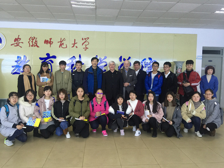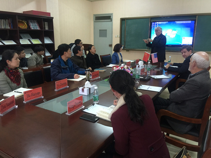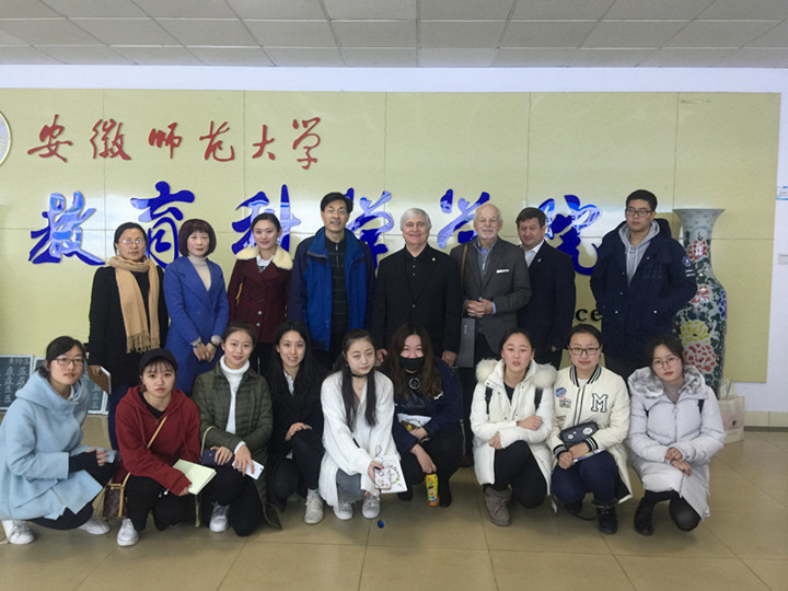 本网讯(教科院 马兴)12月4日,美国布莱诺大学校长Edward Schrader 、Peter Miller、Jim Eck一行来到教育科学学院就中美学前专业人才培养问题与学院师生进行了亲切交谈。交流会由学院院长桑青松主持,学院党委书记刘晓宇、副书记张如华、副院长何海燕、院长助理周元宽、学前教育专业教师赵学菊、及2016级、2017级全体中美学前专业学生参加了此次座谈会。