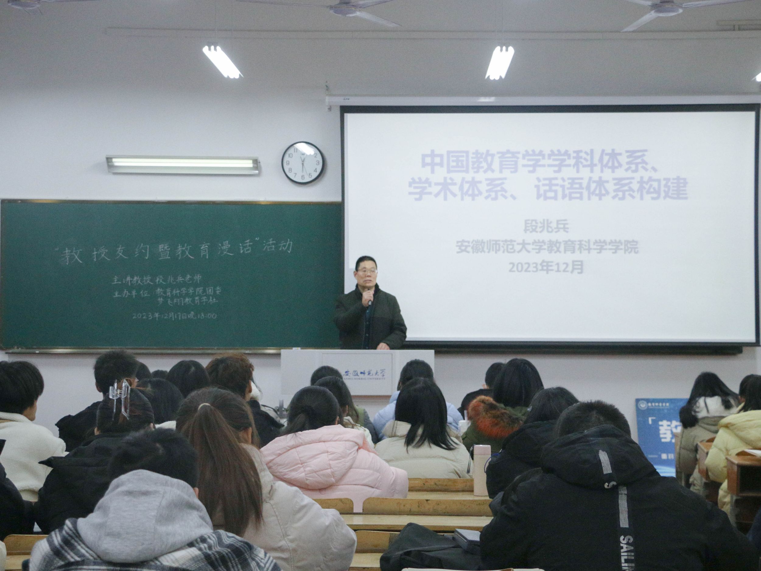 12月17日晚,教育科学学院在赭山校区教学楼1403教室组织开展第三十期“教授友约”活动。本次活动邀请教育学专业博士生导师、教授段兆兵老师到场,为同学们做关于“中国式教育学的学科体系、学术体系、话语体系及其构建”方面的分享。