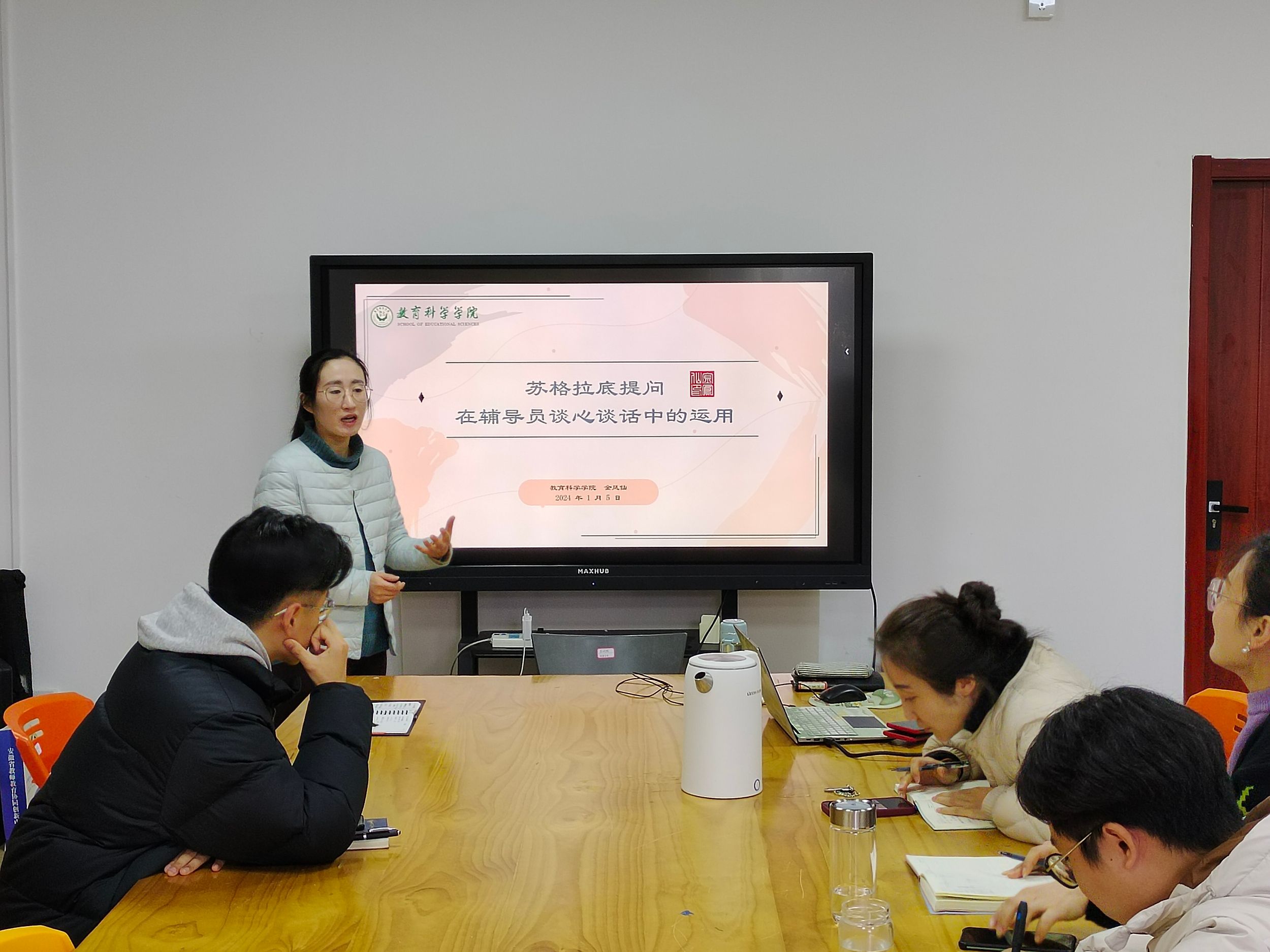 为进一步提升学院学工团队就业指导能力与谈心谈话技巧,切实加强大学生护航工作能力,1月5日上午,教育科学学院于团委办公室开展就业指导与心理培训分享交流会。院党委书记许国飞、党委副书记杜凤、全体专兼职辅导员参加本次会议。