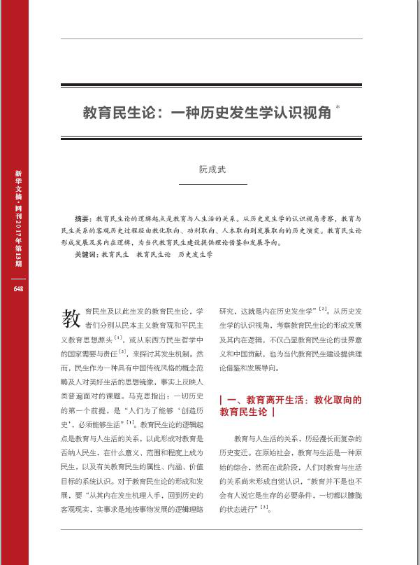 《教育民生论:一种历史发生学认识视角》一文,系作者主持国家社会科学基金教育学一般课题“教育民生保障机制及压力纾解路径研究”(项目编号:BFA140043)的阶段性成果。文章把教育与人生活的关系作为讨论教育民生论的逻辑起点,并从历史发生学的认识视角对教育与民生的关系做了全面的考察,凝练了教育与民生关系的客观历史过程,即经由教化取向、功利取向、人本取向到发展取向的历史演变。教育民生论形成发展及其内在逻辑的揭示,为当代我国教育民生建设提供有益的理论借鉴和政策导向。