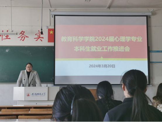 为进一步促进2024届心理学专业本科生充分高质量就业,了解心理学专业毕业生求职动态,3月20日下午,学院在田楼8201教室召开教育科学学院2024届心理学专业本科生就业工作推进会。学院党委副书记杜凤、专业负责人王礼军、辅导员蔡文参加会议,会议由辅导员蔡文主持。