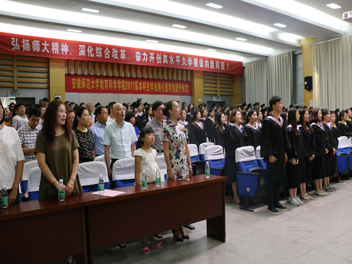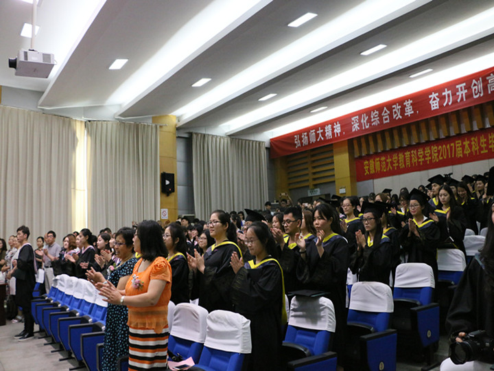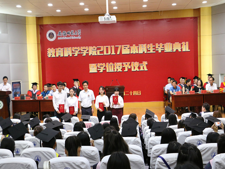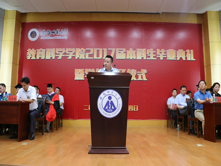 本网讯(教科院 马兴)为谁盛放花满路,教科心如故。纵使时间匆匆,也想为毕业生留下最美好的回忆。6月24日下午,教育科学学院2017届本科生毕业典礼暨学位授予仪式在田家炳教育书院报告厅隆重举行。校党委常委副校长毕明福、教科院实习基地代表、安徽省教师教育协同创新试实验区代表、院友代表、毕业生家长代表、学院党政领导、教授委员会全体成员、各专业负责人、学院教师、各科室秘书等共同为学院178名本科毕业生送别。典礼由学院党委书记刘晓宇主持。