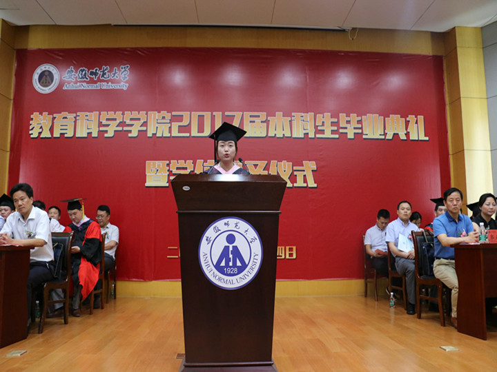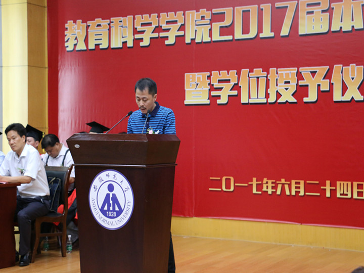 一场盛典,深深祝福只盼诸君前程似锦。“愿你们成为有温度、有高度、有力度的人,做到心中有大爱、眼里有乾坤、胸中有丘壑,脚踏实地,以只争朝夕的使命感、登高望远的责任感,永葆学习之心,勇担时代使命,尽显青春担当。”毕明福副校长的深深祝福与嘱托寄予了毕业生太多希望,他希望毕业生以大胆创新、勇攀高峰、主动引领的精神肩负起时代赋予的神圣使命,在激情奋斗中绽放青春光芒。院长桑青松满怀喜悦的祝贺学生顺利毕业,与同学们追忆了大学四年学院取得的成绩。他希望毕业生“告别过去超越自我”,将过去作为发展的基石,在更大的舞台上做最好的自己;他期待毕业生能够“立足当下成就自我”,在基层一线敢拼敢闯;他如父亲般叮嘱毕业生能够“拥抱未来善待自我”,要努力拼搏也要健康快乐。温情的话语让毕业生离情难舍,眷念无限。校友芜湖市广播电视台副台长韩万春希望毕业生能够永葆大气、正气、灵气、霸气,开创更美好的未来,为母校争光,为学院添彩。毕业生家长代表柏军在对学校学院表示感谢的同时也期待毕业生能够继续将教科院当成自己的家,继续好好努力,报效学院的精心培养。毕业生侯晓丽代表全体178名毕业生表达了对母校深深感恩留念之情。无限祝福感恩,将是我们一生奋斗的动力。