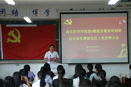 本网讯(文/教科院 裴扬 图/范晨晨)2017年6月7日下午,我院第4期学生党员培训班结业典礼暨新党员入党宣誓大会在田家炳教育书院8101教室举行。院党委书记刘晓宇、副书记张如华、党委秘书马兴、党课班副班主任随小莉以及党课班全体学员、本期发展的预备党员和转正的党员参加了会议。会议由党课班班主任莫大贡主持。