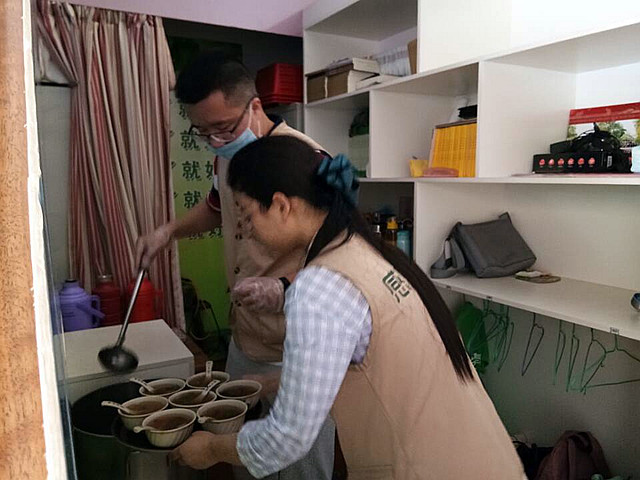 志愿服务后,雨花斋的志愿者们开始素食,恰逢一位雨花斋志愿者谢阿姨的生日,她热泪盈眶地说这是自己六十四年来第一次过生日,能和这么友爱的大家庭在一起,她感到非常幸福。与此同时雨花斋义工们分享了在雨花斋志愿服务多年的经历,大家欢歌笑语,其乐融融。