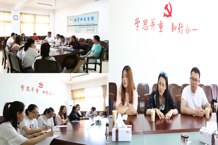 本网讯(教科院 孙力力)5月26日下午,我院召开了教育技术学中美合作班2015和2016级硕士研究生座谈会,院党委书记刘晓宇、副院长聂竹明、2015级研究生辅导员袁同庆共同出席了此次会议。会议由院研究生秘书过婴宝主持,