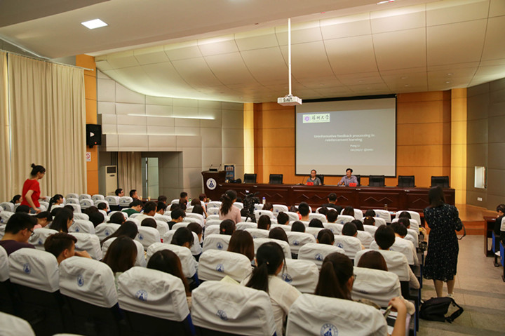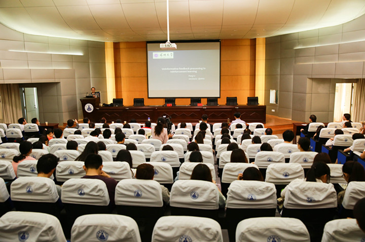 报告以桑青松院长的简短发言作为开场,他强调了学科学术活动周的意义性,感谢院友对学院工作的支持,并着重向大家介绍了李鹏博士。李鹏博士用轻松的语言介绍了自己的求学经历以及对母校师大深厚的感情,活跃了现场的气氛。随后他将专业的学术知识与同学们熟悉的常识相结合,在轻松的氛围中向同学们传达他关于决策后不确定反馈加工的研究。报告深入浅出,引人入胜,同学们都获益匪浅。在之后提问环节,周佳树博士和一众同学都向李鹏博士提问了实验心理学研究的相关问题,李鹏博士都耐心作答。最后,李博士以学长的身份向在座学子表达了自己的鼓励与期待。他说:“如果你觉得这条路还不错的话,那么我的这条路完全是可以复制的,因为我就是师大人!”