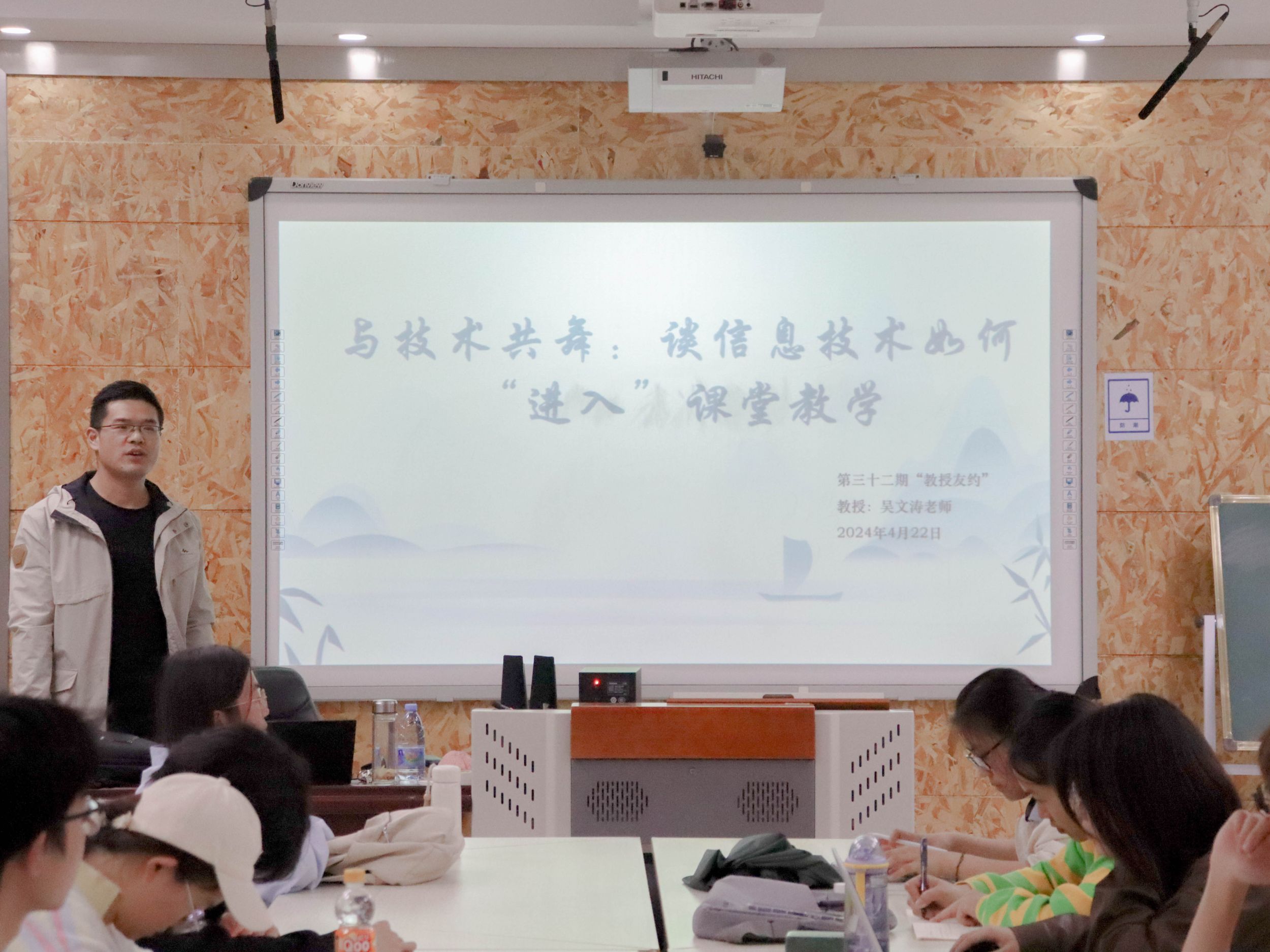 2024年4月22日晚,教育科学学院在田家炳教育书院8502教室开展了第三十二期“教授友约”活动。本次活动邀请吴文涛教授为同学们进行了“与技术共舞,谈信息技术如何‘进入’课堂教学”的分享。