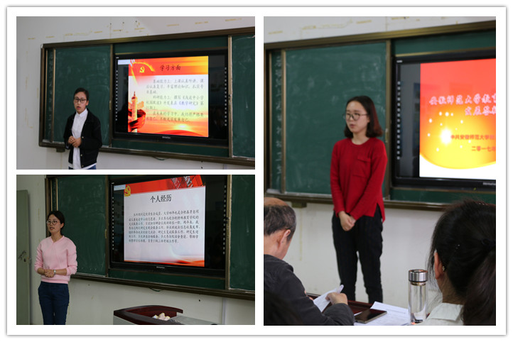 本网讯(文/魏文静 图/胡雪萍)为强化对入党积极分子党性修养的考察,进一步加强党建工作建设、完善学生党员发展体系。我院本着“巩固理论知识、提高党性修养、扩大民主参与”的原则,于5月4日下午在教科院412教室举行研究生积极分子发展答辩。副院长聂竹明、何海燕,研究生秘书过婴宝组成的答辩委员会和研究生党支部学生党员、入党积极分子代表一起参与了本次答辩的评议工作。答辩由心理学党支部书记曹晓芹主持。