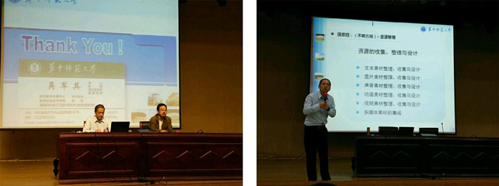 主题报告中,吴教授运用大量的案例和实例阐述了基于项目、基于任务驱动、基于参与体验、基于团队合作、基于动手实践等信息时代新型教学方式的教育理念与方法。之后对于数字教师成长过程中遇到的四大困惑进行详细解释。困惑之一(错误认识):用多媒体学习成绩下降,不用上升。他指出使用媒体要符合教学目标、适合教学对象、符合教学条件、贴近教学内容并且合理选择教学媒体,但是使用媒体的同时,板书是万不可丢弃的。困惑之二(缺乏信心):不懂计算机技术,做课件好难!教师只是课件的设计者,而不是课件的制作者。困惑之三(没有兴趣):做课件工作量大,还是用粉笔黑板方便。吴教授认为多媒体使用可以多感官刺激学生达到更好的记忆效果,另外要善于利用现有教学资源,如:中央电化教馆资源中心(www.cer.com.cn)提供的各类教学资源,提醒教师还有善于发现收集资源。困惑之四(不明方向):到底怎样才能成为一名合格的数字教师,教师应转变观念:教师是学习情境的创设者、学生学习兴趣的激发者、教学活动的组织者、学生建构知识的辅导者,并且要能够驾驭对六类多媒体的合理运用。