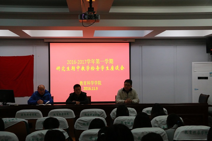 本网讯 (教科院 陈旭/文 陈振/图)11月9日上午, 我院在三楼会议室召开本学期研究生期中教学检查学生座谈会。副院长聂竹明,过婴宝、袁同庆老师,院研会学研部成员、各年级班长参加座谈。