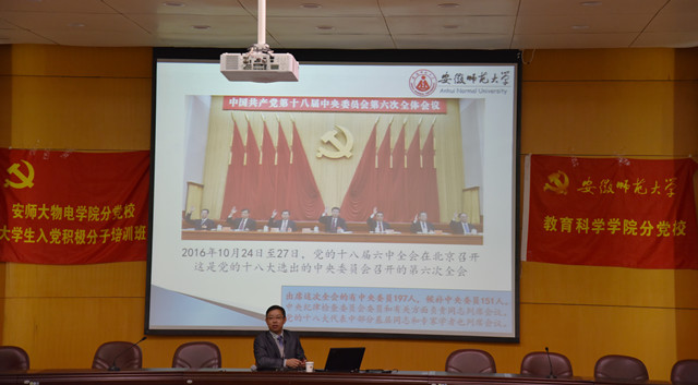 本网讯 (教科院 曹玲玲) 为使学员们深入了解党的十八届六中全会精神,端正思想态度,树立坚定理想信念,11月12日下午,我院与物电学院党校班邀请政治学院张正光教授为学员们讲授关于“在新形势下加强和规范党的政治生活的根本遵循——学习贯彻党的十八届六中全会精神”的讲座。我院党校班班主任莫大贡老师、物电学院党校班班主任李亚老师及200余名学员参加了讲座。讲座由李亚主持。