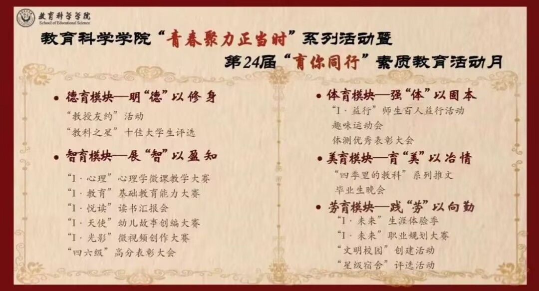 教育科学学院第24“育你同行”素质活动月的开展紧扣立德树人根本任务,充分发挥专业特色,为教科学子提供了类别丰富,形式多样的校园文化活动。学院将继续立足学生特质,不断完善育人机制,推进培养“德智体美劳”全面发展的社会主义新青年。