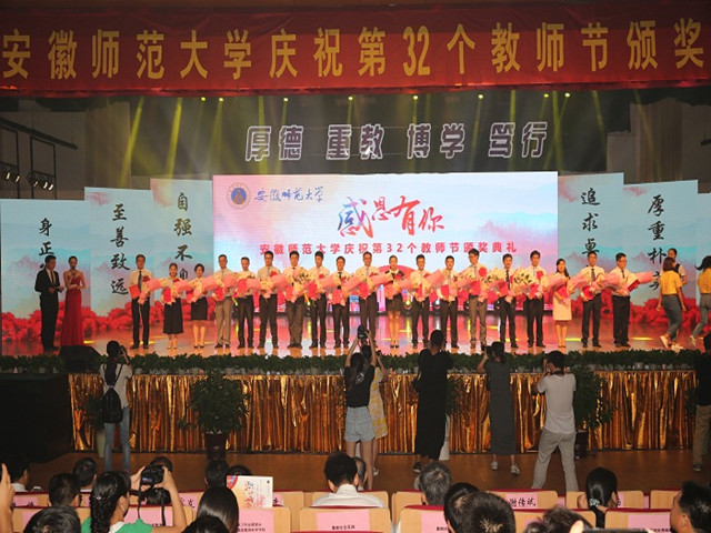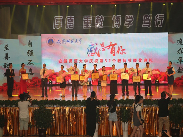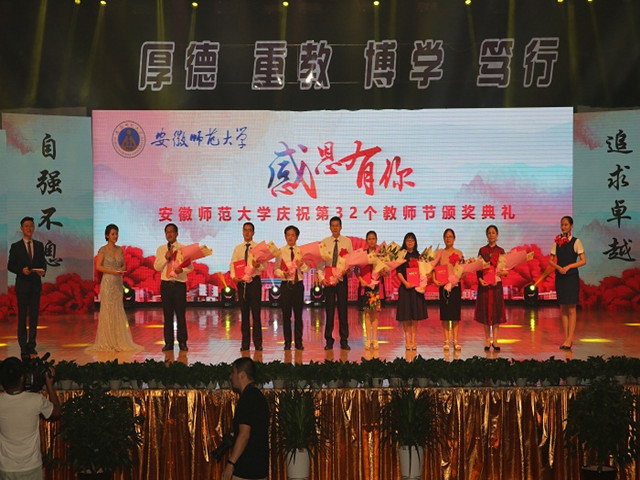 本网讯(教科院 吴文涛)9月10日下午,学校隆重举行第32个教师节颁奖典礼。典礼上,我院多名获奖教师代表参加典礼,接受表彰。伴随着昂扬欢快的音乐,我院受表彰的教师代表胸前佩戴大红花,精神抖擞、容光焕发,迈着自信、从容的步伐,在学生们的热烈掌声和欢呼声中踏上红地毯,走过“星光大道”,感受“明星”般的礼遇,来到签名墙前签名留念,场面热烈而温馨。