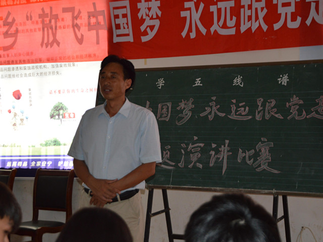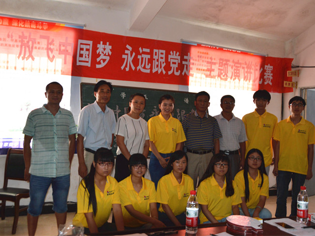 本网讯(教科院 冉琼)7月30日,为深入贯彻党的十八大和全国两会的精神,引导广大青少年全面理解习近平总书记对“中国梦”的深情阐述,畅想民族的复兴--“中国梦”的光明前景,激发青少年树立远大理想。教科院“全心全意”赴冉庙关爱留守儿童调研团队联合冉庙乡乡政府、冉庙中学成功举办“放飞中国梦,永远跟党走”主题演讲比赛。阜阳市文广新局局长韩伟、冉庙乡乡政府宣传委员兰李星、冉庙中学校长来红良,冉庙中学团委负责人高川莅临指导。