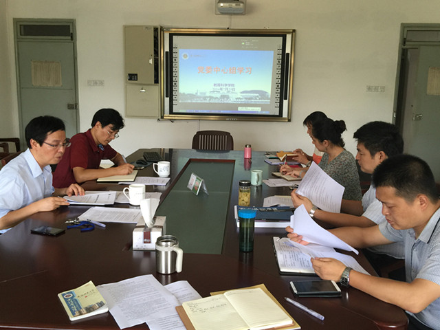 本网讯(教科院 马兴)7月25日下午,教科院党委中心组全体成员集中学习了习近平总书记“七一”重要讲话精神及《中国共产党问责条例》、《中国共产党巡视工作条例》、《中国共产党地方委员会工作条例》等文件精神。