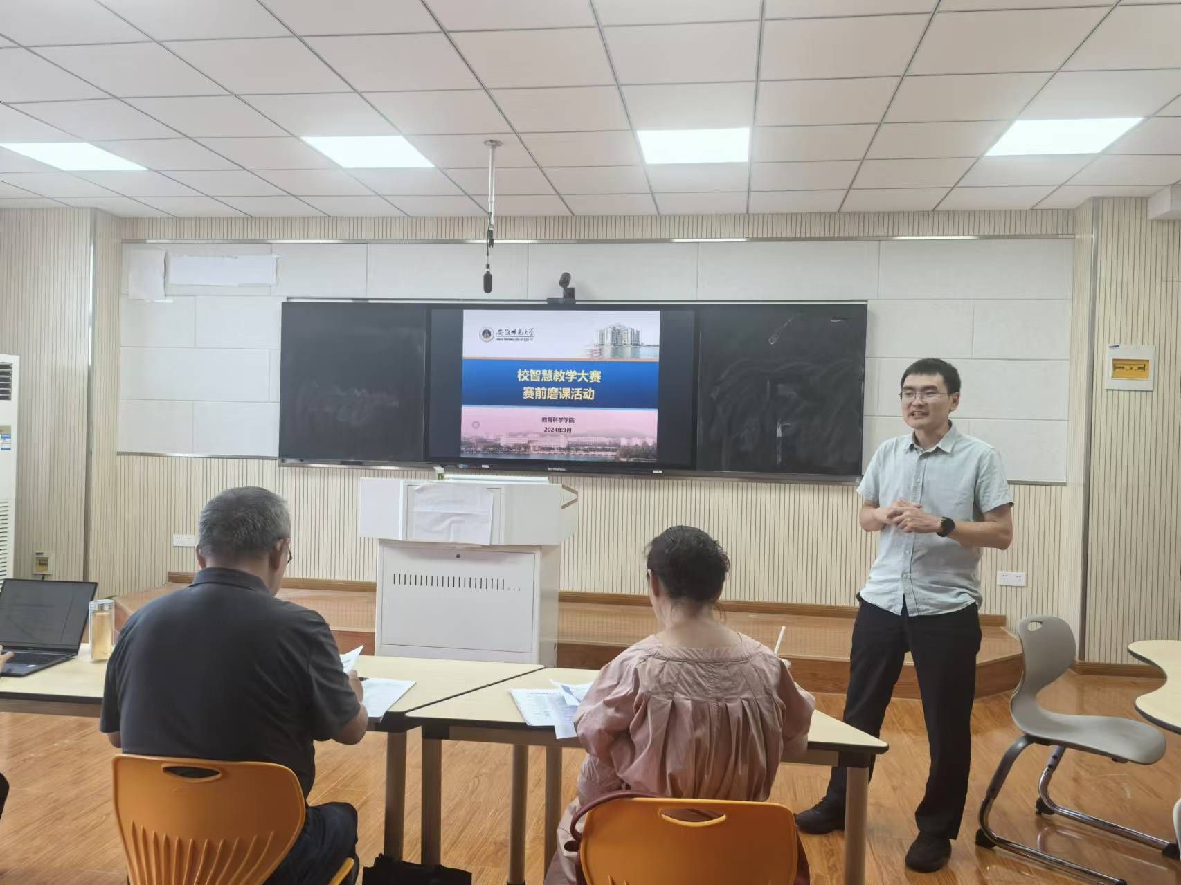 9月11日下午,我院在田楼8606智慧教室开展了青年教师教学能力提升暨智慧教学大赛校赛选手磨课活动活动由学院副院长韩建涛主持,评委专家包括周兴国、金维才和全莉娟三位老师。本次磨课旨在为即将参加智慧教学大赛的青年教师吴钦金、谢宇、金马妮和周进四位提供赛前指导,提升他们的教学质量与效果,同时也为学院其他青年教师创造了学习和交流的机会。