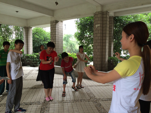 7月7日上午,春芽阳光家园进行了例行的周四社区活动,到附近的小区锻炼身体,同时增进与居民的相处。沈老师在出行前将学员分成五组:篮球组、排球组、羽毛球组、健身器材组和音乐组。伴着高温和烈日,老师和志愿者们带着学员来到附近小区,在志愿者的帮助下,每个小组的活动顺利展开。其中音乐组的陆敏和杨婧婧同学为了让学员更深切地感受音乐的节奏和律动,结合在安师大学前教育专业的舞蹈课所学,教学员们学跳舞蹈《小马驹》。这支舞蹈音乐欢快,动作简单,学员们学起来既能感受到音乐带来的快乐,也能体会到满满的成功。不仅学员们学得开心,就连一旁的老师也随着音乐不由自主地舞蹈起来了!看着大家灿烂的笑脸,我们的心中暖洋洋的。