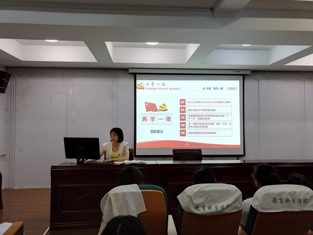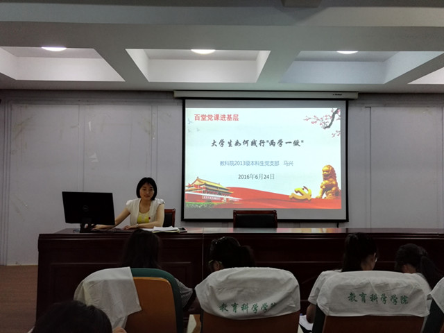 会上,马兴首先向大家介绍了当前国家开展的“两学一做”学习教育的活动背景、实施要求、学习内容与主要措施。她指出,“两学一做”的主体是党员每一个人,需要每一个党员自觉自主自动地去贯彻落实,这不是因为“两学一做”学习教育的要求,而是身为一个党员应该要去做的努力。接着,她结合习近平主席论·如何做一名合格共产党员,提出了大学生党员应成为“两学一做”的宣传者和实践者,认真学习党章党规,学习习近平讲话精神,在专业学习、为人处事、立身立言上不断追求卓越,争做合格党员。